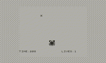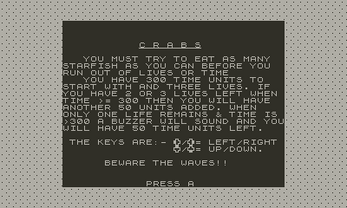 Playing the part of a crab you must eat as many starfish as you can before you run ourt of time or lives. Avoid the waves which will wash you away if you are caught. The game has very good graphics and sound. Crab was written by P Hammond of Ipswich, Suffolk.